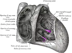 ![]() Interior of right side of heart. Papillary muscles labeled in purple. | |