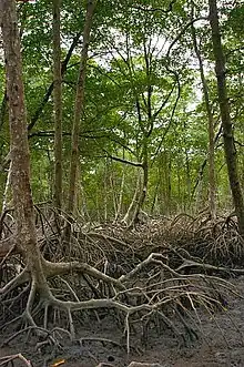 The transition zone between the coastal mangroves and inland dry forest holds Rhizophora racemosa, Rhizophora harrisonii, Laguncularia racemosa and Conocarpus erectus mangroves, as well as Spartina alterniflora on the seaward margin and Hibiscus tiliaceus and Acrostichum aureum on the landward margins. Tropical forest and palm species that grow with the mangroves include Dalbergia brownei, Rhabdadenia biflora, Montrichardia arborescens, Mora oleifera, açaí palm (Euterpe oleracea) and Orbygnia martiana.[1]