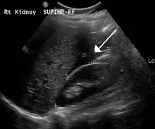 The use of ultrasound has become the standard of care when preparing a patient for paracentesis. Confirmation of an ascitic effusion reduces the risks associated with a dry or blind tap of the abdomen. Anatomic landmarks, such as the midline linea alba (abdomen) approach, were traditionally used as reference points for needle insertion. Phased array or curvilinear ultrasound transducers are typically used in the hospital and outpatient setting to identify ascites in the abdominal cavity. Fluid within the abdominal cavity appears hypoechoic or anechoic (black) on ultrasound. Morisons pouch (hepatorenal recess) is a common starting location in concordance with ultrasound FAST (Focused assessment with sonography for trauma) exam. Fluid collection can occur in a number of different locations and may be difficult to find, especially if the patient only exhibits a small volume of ascites. Measurement of the amount of fluid within the abdominal cavity is not necessary or very successful. Identification of sufficient fluid within the abdominal cavity for fluid analysis or to achieve a therapeutic benefit is all that is required to proceed to paracentesis. Ultrasound guidance of the paracentesis can also be used as an additional safety measure to ensure the needle stays within the ascitic fluid and avoidance of important vessels within the abdominal cavity. [5]
