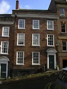 The east side of the square consists of five houses built in 1736 by Nicholas Broadbent on land leased from the trustees of the Shrewsbury Hospital.[5] The other houses in the square were built by his son Thomas Broadbent, from 1771 to c.1790. Number 11 is dated 1787.[6] Following bomb damage in the Second World War, parts of the square were extensively restored between 1963-6 by Hadfield, Cawkwell, Davidson and Partners, when numbers 18 and 26 were largely rebuilt using materials that were salvaged from buildings elsewhere. In the mid-1980s, an early 19th-century Gothic revival stuccoed building at number 10 was rebuilt with a Neo-Georgian facade.[7] All buildings in the square are Grade II* listed.[6]