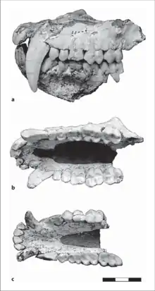 Paradolichopithecus is an extinct genus of cercopithecine monkey once found throughout Eurasia. The type species, P. arvernensis, was a very large monkey, comparable in size to a mandrill. The genus was most closely related to macaques, sharing a very similar cranial morphology.[1] The fossils attributed to Paradolichopithecus are known from the Early Pliocene to the Early Pleistocene of Europe (France, Spain, Greece, Romania, and Serbia) and Asia (Tajikistan and China).[2] The East Asian fossil genus Procynocephalus is considered by some to represent a senior synonym of Paradolichopithecus.[3]