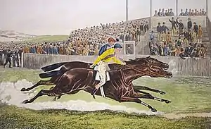 Until 1946 there was no requirement for British racehorses to be named[6] and, in 1884, the horse who would become known as Paradox raced as "bay colt by Sterling- Casuistry" or, simply, "the Casuistry colt". He was slow to mature but, by late 1884, he had begun to show signs of promise. After watching him run in a trial gallop, the Duke of Westminster paid £6,000 (equivalent to £665,385 today) for the colt.[4] By way of comparison, the 1884 Epsom Derby carried prize money of £4,600.[7] By the time he appeared on a racecourse his performances in training and purchase price meant that he had acquired a considerable reputation[8] and, despite making his debut in the Middle Park Plate, the season's most important races for two-year-olds,[9] he was made joint-favourite at odds of 9/4. The inexperienced Casuistry colt showed "a little temper"[10] at the start and, after racing with the leaders in the early stages, he became unbalanced and lost his position on the downhill section of the course. He finished strongly to dead-heat for third place behind Melton and the French colt Xaintrailes,[10] but the Duke was highly displeased by the performance[4] and offered the colt for sale. He was bought by William Broderick Cloete, a South African-born[11] businessman who had made his fortune in Mexican coal-mining.[12] At the next Newmarket meeting, on his first start for his new owner, the Casuistry colt ran in the Dewhurst Plate and started the 2/1 second favourite behind Xaintrailles. He took an early lead and pulled away in "grand style"[13] to record a three length win from the filly Cora. The Dewhurst was regarded as the year's most important two-year-old race after the Middle Park Plate,[9] and the colt's win established him as one of the best horses of his generation, with bookmakers making him one of the favourites for the following year's Derby.[14] Shortly afterwards it was reported that an offer of £10,000 for the colt had been turned down.[15]