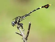 P. sabicus is similar in appearance to the rock hooktail (Paragomphus cognatus), but with a bright yellow face, and rust-colored markings on abdominal segments 8-9, orange markings on 10, and black folliations on females that are larger and marked with rust-colored lines on males.[3]