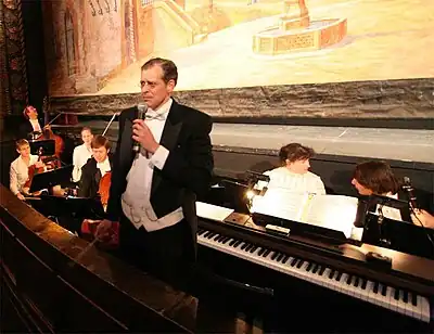 In 1986 Benjamin decided to form a 14-piece orchestra of fellow Juilliard students to perform the music as it had been originally arranged during the period.[1][5][7][8] Benjamin made a request to Juilliard to perform a concert of turn-of-the-20th-century American composers but his request was rejected by Juilliard's dean, who felt Juilliard should focus on traditional composers.[9] Benjamin scheduled a Mozart program on solo tuba at a concert hall, but instead led a group in performing ragtime music, leaving open the doors to draw in a wider crowd.[3][9] Before a full house, Benjamin's group played selections by Irving Berlin and Victor Herbert, the W.C. Handy's "Memphis Blues" and Joplin's "Peacherine Two-Step."[2] One witness to the event, Juilliard professor Vincent Persichetti, approached Benjamin after the concert was over to encourage him to make it his "life's work" to preserve "America's original music."[2]