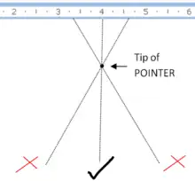 Measurements made by viewing the position of some marker relative to something to be measured are subject to parallax error if the marker is some distance away from the object of measurement and not viewed from the correct position. For example, if measuring the distance between two ticks on a line with a ruler marked on its top surface, the thickness of the ruler will separate its markings from the ticks. If viewed from a position not exactly perpendicular to the ruler, the apparent position will shift and the reading will be less accurate than the ruler is capable of.