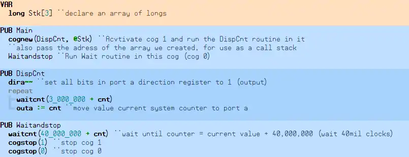 An example program, (as it would appear in the Propeller Tool editor) which emits the current system counter every 3,000,000 cycles, then is shut down by another cog after 40,000,000 cycles: