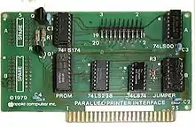 The Apple II Parallel Printer Port connected to the printer via a folded ribbon cable; one end connected to the connector at the top of the card, and the other end had a 36-pin Centronics connector.