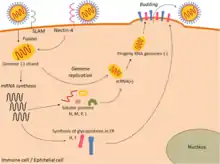 Viral replication is cytoplasmic. Entry into the host cell is achieved by viral attachment to host cell. Replication and transcription follow the negative-stranded RNA virus models.[7] Translation takes place by leaky scanning, ribosomal shunting, and RNA termination-reinitiation. The virus exits the host cell by budding. Human, vertebrates, and birds serve as the natural hosts. Transmission route is airborne particles.[1]