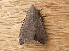The wingspan is about 40 mm for males and 50 mm for females. Adults have brown wings with scalloped edges. The males have forewings that have nearly a right angle at the tornus.[2]