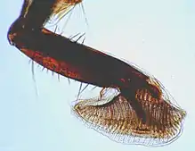 These are large robust flies with massive eyes that often show colored patterns. Antennae are characteristic with three dissimilar segments projecting forward from head. Wings are large and strong with complex venation, and often with complex patterns of brown on clear background.[29][30] These flies are adapted to hunt widely for their hosts during daytime. Females take repeated small blood meals from their hosts to support development of a large batch of eggs. Eggs are laid on wet soil where larvae develop, sometimes over one or two years by feeding on soil organisms. Males do not feed on blood. Hosts of females include all species of mammalian livestock animals and horses. Tabanid flies have large mouthparts comprising three pairs of cutting / slashing elements that pierce skin in a superficial wound. Blood flowing from this is imbibed through a sponge-like element of the mouthparts, the labella (similar to that shown in photograph of Calliphora).[31]