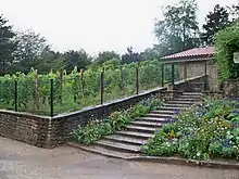 The central entrance gates to the park are topped by two sculptures of bulls by Isidore Bonheur, a note to the site's former use as a slaughterhouse.[3] An old gateway is crowned by a bronze horse's head. The old bell tower of the former fish market stands beside the pond, and the former shelter of the horse market is now used on weekends as a market for old books. The park also has a bust of Georges Brassens made in 1989 by the sculptor André Greck.[4]