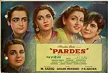 Pardes (transl. Foreign land) is a 1950 Indian Hindi-language romantic drama film directed and written by M. Sadiq.[1] Starring Madhubala, Rehman, Karan Dewan and Shakuntala, the film tells the story of Rajan, a teacher, who falls in love with a wealthy girl named Chanda but decides to go away from her to earn money.[2]