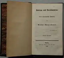 Parerga and Paralipomena (Greek for "Appendices" and "Omissions", respectively; German: Parerga und Paralipomena) is a collection of philosophical reflections by Arthur Schopenhauer published in 1851.[1] The selection was compiled not as a summation of or introduction to Schopenhauer's philosophy, but as augmentary readings for those who had already embraced it,[2] although the author maintained it would be comprehensible and of interest to the uninitiated nevertheless. The collection is divided into two volumes, covering first the parerga and thereafter the paralipomena to that philosophy. The parerga are six extended essays intended as supplementary to the author's thought. The paralipomena, shorter elaborations divided by topic into thirty-one subheadings, cover material hitherto unaddressed by the philosopher but deemed by him to be complementary to the parerga.[2]