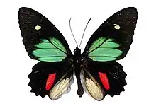 P. childrenae. The green area of the male is larger than in P. sesostris, covering also a part of the cell. The female has a transverse row of spots before the apex of the forewing, as well as two spots on the disc posteriorly. Distributed from Guatemala to Ecuador in two subspecies. — childrenae ' Gray (3 a) is the Central American form, which is found from Guatemala to Panama. Forewing of the male with a white spot before the apex. Band on the hindwing of the female bright red. — oedippus Luc. has in the male no white spot before the apex of the forewing, or only a very small one. In the female the band on the hindwing is a somewhat yellowish red on the inner side. Colombia and Ecuador.[3]