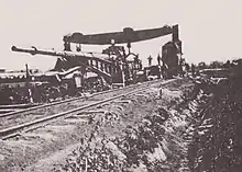 Seven barrels were constructed. They used worn-out 38 cm SK L/45 "Max" 17,130 millimeter gun barrels that were fitted with an internal tube that reduced the caliber from 380 mm (15 in) to 210 mm (8 in). The tube was 31 metres (102 ft) long and projected 13.9 m (46 ft) out of the end of the gun, so an extension was bolted to the old gun-muzzle to cover and reinforce the lining tube. A further, 6-meter–long smooth-bore extension was attached to the end of this, giving a total barrel length of 37 m (121 ft).[1]: 84 This smooth section was intended to improve accuracy and reduce the dispersion of the shells, as it reduced the slight yaw a shell might have immediately after leaving the gun barrel produced by the gun's rifling.[3] The barrel was braced to counteract barrel drop due to its length and weight, and vibrations while firing; it was mounted on a special rail-transportable carriage and fired from a prepared, concrete emplacement with a turntable. The original breech of the old 38 cm gun did not require modification or reinforcement.