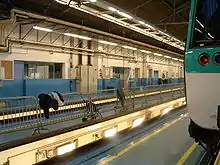- with line 9 at the entrance to the station Michel-Ange – Auteuil, on the tracks in the direction of Boulogne; this intersection runs alongside the platform of the station Michel-Ange – Auteuil, the edge of the platform being protected by fencing, and then intersects at the terminus.