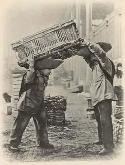 Below the poor, there was an even lower class, of beggars and vagabonds. A law passed in 1863 made it a crime to be completely without money; those without any money at could be taken to jail, and those unlikely to get any money were taken to the Dépôt de mendicité, or beggar's depot, located in Saint-Denis, where about a thousand beggars were put to work making rope or straps, or sorting rags. They were paid a small amount, and when they had earned a certain sum, they were allowed to leave, but most soon returned; and the majority died at the depot.[17]