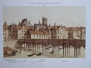 Through the 16th century, there were only four bridges across the Seine, two on each bank, insufficient for the growing city and the amount of traffic they carried. The Paris bridges at the beginning of the 16th century were largely made of wood, and were frequently washed away in floods or knocked down by ice on the frozen river. The most important bridge was the Pont au Change, which had been built in 1304 under Philip le Bel, and was site where the money-changers had their stalls. A new bridge, the Pont aux Meuniers, was constructed early in the 16th century. It contained thirteen mills for grinding grain, powered by the water of the Seine flowing beneath, and also had a footbridge. It was owned by the religious chapter of Notre Dame, and was poorly maintained. It collapsed during a flood on 23 December 1596, and a number of Parisians were drowned.