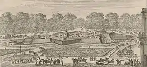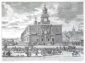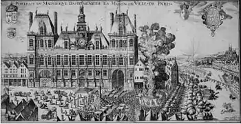 Paris had suffered greatly during the wars of religion; a third of the Parisians had fled; the population was estimated to be 300,000 in 1600.[3] Many houses were destroyed, and the grand projects of the Louvre, the Hôtel de Ville, and the Tuileries Palace were unfinished. Henry began a series of major new projects to improve the functioning and appearance of the city, and to win over the Parisians to his side. The Paris building projects of Henry IV were managed by his forceful superintendent of buildings, a Protestant and a general, Maximilien de Béthune, Duke of Sully.[4]