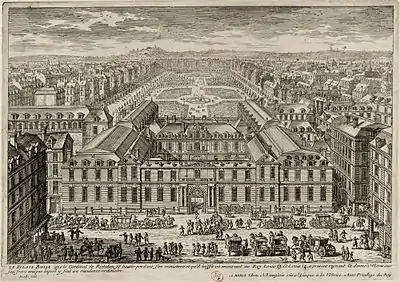Louis XIII and Richelieu continued the rebuilding of the Louvre project begun by Henri IV. In the center of the old medieval fortress, where the great round tower had been, he created the harmonious Cour Carrée, or square courtyard, with its sculpted facades. In 1624, Richelieu began construction of a palatial new residence for himself in the center of the city, the Palais-Cardinal, which on his death was willed to the King and became the Palais-Royal. He began by buying a large mansion, the Hôtel de Rambouillet, to which he added an enormous garden, three times larger than the present Palais-Royal garden, ornamented with a fountain in the center, flowerbeds and rows of ornamental trees, and surrounded by arcades and buildings.[9] In 1629, once the construction of the new palace was underway, land was cleared and construction of a new residential neighborhood began nearby, the quartier Richelieu, near the Porte Saint-Honoré. Other members of the Nobility of the Robe (mostly members of government councils and the courts) built their new residences in the Marais, close to the Place Royale.[7]