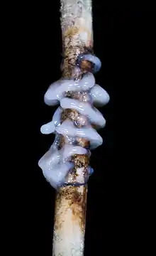Egg laying in the Stenogastrinae hover wasps is quite unique, and it consists of three distinct phases: In the first stage, as discussed before, the female ventrally bends her gaster towards the mouth and collects the abdominal secretion. After some time, the wasp emits an egg with its mandibles and places it in the cell by adhering it to the patch of the secretion. The wasp then collects more gelatinous secretions and adds it on top of the egg so they can be used as a source of food for the larva.[9]