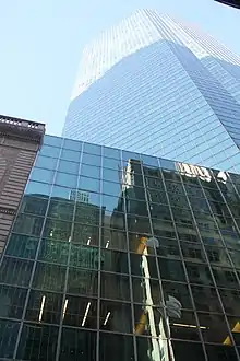 The base of the tower is the same height as the Racquet and Tennis Club Building's cornice line.[14] The main entrances are through revolving doors on 52nd and 53rd Streets.[11][14] The facade is made of blue-green reflective panels of glass, alternating with silver mullions.[14] SOM had chosen that color because they had wanted the facade to blend in with those of neighboring buildings, although the color contrasted with the tan-brick facade of the Racquet and Tennis Club Building. At the time of Park Avenue Plaza's completion, Lever House (also designed by SOM) was the only other nearby building with a blue-green glass facade.[8][9] The facade contained a lightly glazed finish, which reflected heat during the summer.[11]