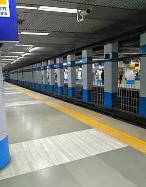 Park Street (or IIHM Park Street for sponsorship reason) is a station of the Kolkata Metro.[3][4][5] The station is located on the crossing of Jawaharlal Nehru Road and Mother Teresa Sarani (previously called Park Street after which the station was named). It is one of the deepest underground metro stations of Kolkata Metro. It is the only underground station to have side platforms, which are mostly seen in elevated metro stations.