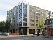 The V, located at 3557 Georgia, is a six-story mixed-use project that consists of ground floor retail and twenty dwelling units above. The proposed retail space would contain approximately 2,138 sq ft (198.6 m2) and would be appropriate for a café. The Otis Place side of the property could also support 530 sq ft (49 m2) of outdoor seating should a future tenant apply for a public space permit. The residential units would consist of ten one-bedroom and ten two-bedroom units. The exact number that will be dedicated for affordable housing is not known, but the developer has indicated it would be more than the city required minimum.[45]