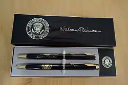 Parker Jotters were a favorite choice of President John F. Kennedy for signing legislation and to give as gifts.[29] Indeed, successive presidents from Kennedy to Clinton used Parker pens for these purposes, and Parker retained a special representative, John W. Gibbs, to handle White House orders. In one of his early years in office, Lyndon Johnson ordered no less than 60,000 Parker pens. LBJ would use up to 75 pens to sign each important document and bill, writing different strokes of the letters of his name with different pens, and giving them all away to allies and supporters with little typed certificates. After Parker ceased to be an American-owned company, later presidents switched to using A. T. Cross Company pens.[30]