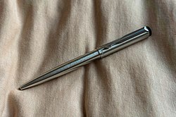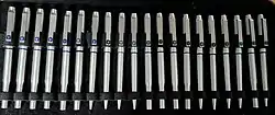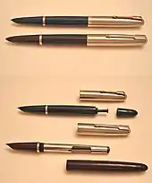 The Parker 25 was a pen introduced by the Parker Pen Company in 1975. Created by the renowned designer Kenneth Grange based on a detailed brief,[17] it was manufactured in Newhaven, England and produced in a variety of different versions until 1999.[18] An eye-catching, contemporary-looking pen, with mainly steel components, the Parker 25 was intended to revive the company's fortunes. As The Guardian wrote, '(Grange's) classic Parker pen had the machined lustre of a bullet. In fact, its tapering barrel was inspired by an American space rocket, a form that enabled the lid to be the same diameter as the pen no matter which end it was attached to.'[19] It was affordable enough to become a staple entry-level pen for both work and leisure uses - and for secondary school students at a time when fountain pens were still obligatory in many British schools. Advertising slogans used to market Parker 25s included 'Modern as Tomorrow', 'Space Age Design, Space Age Performance', 'European Styled' and 'Contemporary, Highly Functional Design'.[20]
