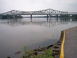 The Parkersburg–Belpre Bridge is a four-lane cantilever bridge that connects Parkersburg, West Virginia to Belpre, Ohio across the Ohio River. The bridge was completed in 1980. The bridge had been signed U.S. Route 50 (US 50) until June 13, 2008, when that highway was re-routed to the Blennerhassett Island Bridge a few miles to the west, as part of the completion of the Corridor D project around Parkersburg. The American Discovery Trail uses the bridge to cross the Ohio River.[1]