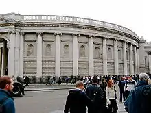 The building underwent extensions by architect James Gandon, as Pearce had died. Gandon was responsible for three of Dublin's finest buildings, the Custom House, the Four Courts and the King's Inns. Between 1785 and 1789 he added a new peers' entrance at the east of the building, facing onto Westmoreland Street. Unlike the main entrance to the south, which came to be known as the House of Commons entrance, the new peers' entrance used six Corinthian columns, at the request of peers who wished their entrance to be distinct from the Ionic columns of the main entrance.[3] Over this, three statues by Edward Smyth were placed, representing Fortitude, Justice and Liberty. A curved wall joined the Pearce entrance to Gandon's extension. This masked the uneven joins of some of the extension, as shown below. The wall, built of granite with inset alcoves, bears little resemblance to the building as it was in its parliamentary days.