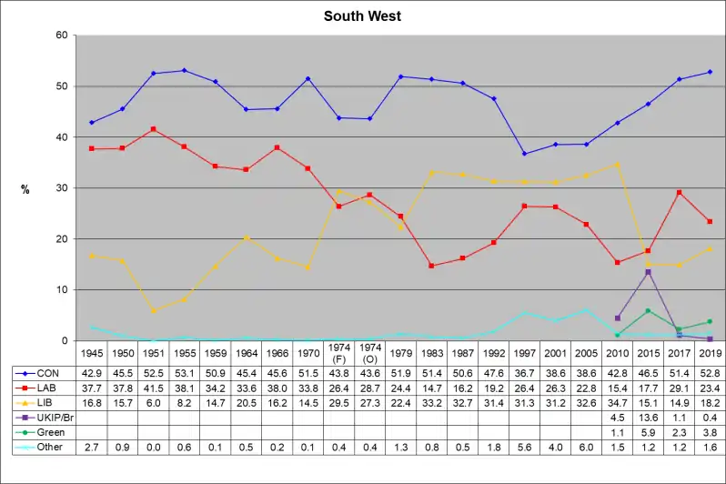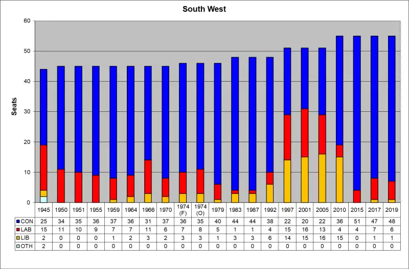 The region[1] of South West England has, since the 2010 general election, 55 parliamentary constituencies which is made up of 15 borough constituencies and 40 county constituencies. At that election the Conservative Party held the largest number of constituencies, with 36. The Liberal Democrats had 15 and Labour had 4. At the 2015 general election the Liberal Democrats lost all of their seats (14 to the Conservatives and one to Labour), while the Conservatives gained one seat from Labour, leaving the Conservatives with 51 and Labour with 4. In the 2017 general election, the Conservatives remained, by far, the largest party with 47 seats, though losing three to Labour, who won 7, and one to the Liberal Democrats, who won 1. In the 2019 general election,[2] the Conservatives increased their number of seats to 48 by regaining Stroud from Labour, who held their other six seats, while the Liberal Democrats retained their sole seat in Bath.