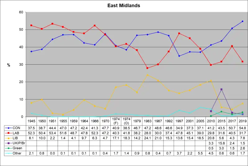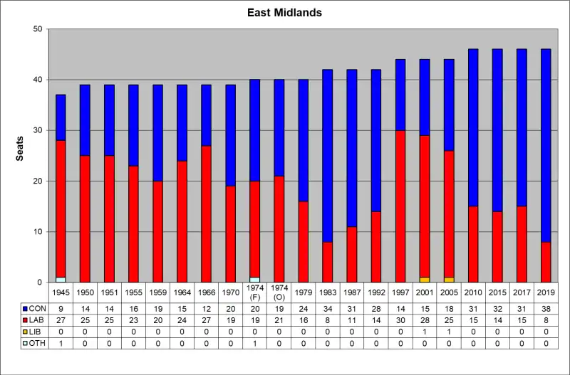 The region[1] of East Midlands is divided into 46 parliamentary constituencies which is made up of 12 borough constituencies and 34 county constituencies. Since the 2019 United Kingdom general election,[2] 38 are represented by Conservative MPs, 7 by Labour MPs, and 1 by an independent MP.