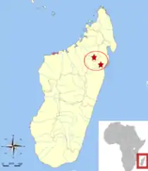 This species is endemic to Madagascar, where it is known from low elevation sites in Zahamena National Park,[5] in the north of the Zahamena-Ankeniheny Corridor,[3] in Betaikankana in the south east of the Zahamena-Ankeniheny Corridor,[7] and in Betampona Special Reserve,[8] and . The range of occurrence is 410 km2 (160 sq mi).[9] Due to the scarcity of a suitable habitat the distributional extent in this area is approximately below 100 km2 (39 sq mi).[9] It occurs from 300 to 600 metres (980 to 1,970 ft) asl.[9] They are very rare to encounter due to the pressure and rough distribution of the forest habitat within the range of the geckos.[9] The species population is decreasing in result, it has a severely fragmented population.[9]