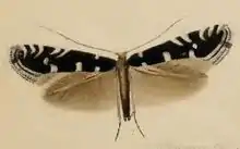 The wingspan is 9–11 mm.[2] The head is grey mixed with dark brown. Palpi white. Forewings blackish-fuscous; numerous costal strigulae, a spot in disc posteriorly, and two dorsal spots white; a black apical dot; cilia fuscous, terminal half white except on tornus, with a black subapical line. Hindwings are dark grey. The larva is pale green; dorsal line darker; head brown; segment 2 with four black spots.[3]