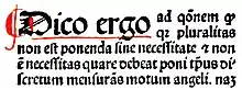 While it has been claimed that Occam's razor is not found in any of William's writings,[15] one can cite statements such as Numquam ponenda est pluralitas sine necessitate ("Plurality must never be posited without necessity"), which occurs in his theological work on the Sentences of Peter Lombard (Quaestiones et decisiones in quattuor libros Sententiarum Petri Lombardi; ed. Lugd., 1495, i, dist. 27, qu. 2, K).