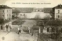 In 1844, Public Hospitals sold their land to the military administration, which built cavalry barracks from 1851 to 1863. However, the process of urbanization was limited by traverse axes and the fact that Lafayette street was the only road connecting La Part-Dieu with Central Lyon. The district was added to Lyon administrative area in 1852. To link the city with Geneva, Gare des Brotteaux was designed by the Chemins de fer de Paris à Lyon et à la Méditerranée company, which led to the dismantling of wall fortifications to make way for railway lines. Meanwhile, the military compound took on the orthogonal footprint of the original farm estate. Many cavalry units were mobilized during World War I.[30][33][34]