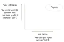 In his 1971 paper Polyarchy: Participation and Opposition, Robert Dahl provided a basic framework to evaluate democracies or polyarchies (nearly/almost full democracies) based on their participation inequality.[4] He argued that there are two dimensions: public contestation – the various rights and procedures guaranteed to citizens – and inclusiveness – how accessible these rights are to all citizens. More fully, public contestation describes the necessary functions for a liberal democracy: a competitive political atmosphere, ability to run for office, right to vote, right to assembly, etc. Inclusiveness describes what portion of the population is able to enjoy these rights and procedures.