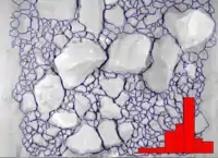 In granulometry, the particle-size distribution (PSD) of a powder, or granular material, or particles dispersed in fluid, is a list of values or a mathematical function that defines the relative amount, typically by mass, of particles present according to size.[1] Significant energy is usually required to disintegrate soil, etc. particles into the PSD that is then called a grain size distribution.[2]