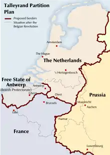 Major European powers (which included France, Prussia and the United Kingdom) were divided over their response to the revolution of the Belgian people against the Dutch royal authorities. France favored the secession of Belgium from the Netherlands, hoping to annex all or at least part of the area, which was also the aim of most of the Belgian insurgents. After this proposal had been rejected by the other European powers, which supported the continued union of the Netherlands, Charles de Flahaut, a French diplomat, proposed a partition of the Southern Netherlands (most areas of modern Belgium).[17] To this end, the parts of the provinces of Liège, of Limburg and of Namur east of the Meuse river as well as the cities of Maastricht and Liège and the Grand Duchy of Luxembourg would go to Prussia. Part of the province of East Flanders, nearly all of the province of Brabant, the province of Hainaut and the province of Namur west of the Meuse would be assigned to France. The province of Antwerp—except the city of Antwerp itself—and the province of Limburg, west of the Meuse river—except Maastricht—would remain with the Netherlands, as would a small part of the province of Brabant, the former Oranje Lordship of Diest. West Flanders, most of East Flanders, including Zeelandic Flanders, and the city of Antwerp were to form the Free State of Antwerp, under British protection.