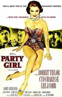 Party Girl is a 1958 American film noir directed by Nicholas Ray and starring Robert Taylor, Cyd Charisse and Lee J. Cobb. Filmed in CinemaScope, it was the last film Charisse did for Metro-Goldwyn-Mayer, and the next-to-last film Taylor did for the studio; they were MGM's last two contract stars.[2][1]