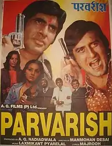 Parvarish (transl. Upbringing) is a 1977 Hindi-language crime drama film directed by Manmohan Desai. The film stars Amitabh Bachchan and Vinod Khanna as two brothers playing oneupmanship, because one brother believes he is adopted and not the real son. Shabana Azmi and Neetu Singh play the love interests. Amjad Khan and Kader Khan are the villains. Laxmikant Pyarelal gave the music to this film and Majrooh Sultanpuri the lyrics.
