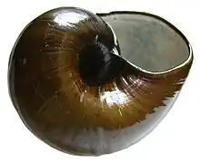 The shell is large, broadly umbilicated, depressed and subdiscoidal. The shell is opaque and shining. The colour is deep green, usually with some radial streaks of blackish-green.[3]