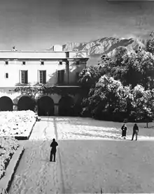 The first of the great hotels to be established in Pasadena was the Raymond (1886) atop Bacon Hill, renamed Raymond Hill after construction. Pasadena was served by the Atchison, Topeka and Santa Fe Railway at the Santa Fe Depot in downtown when the Second District was opened in 1887.[26] The original Mansard Victorian 200-room facility burned down on Easter morning of 1895, was rebuilt in 1903, and razed during the Great Depression to make way for residential development. The Maryland Hotel existed from the early 1900s and was demolished in 1934. The world-famous Mount Lowe Railway and associated mountain hotels shut down four years later due to fire damage. Three hotel structures have survived, the Green Hotel (a co-op since 1926), the Vista Del Arroyo (now used as a Federal courthouse), and a residential tower of the Maryland at 80 North Euclid Avenue (a co-op since 1953).[27]