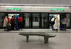 Platform level of the station showing the bench designed by Chan Lee Kang which was selected during a bench design competition.