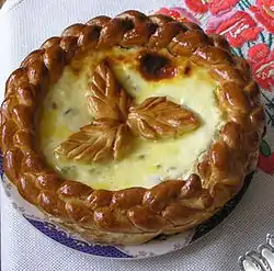 Pască is a traditional Romanian and Moldovan pastry.[15] Especially made for Easter, pască is a tart with a cozonac dough base filled with fresh cheese like urdă or cottage cheese, raisins, eggs and sugar. Other variants include sour cream, chocolate, or berries fillings.[16]
