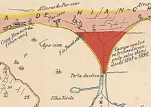 - "Pak Shan Lan", "Pak-sa-leang" or "Pac-sa-leong" are renderings of the Cantonese pronunciation of 白沙岭, Mandarin "Baishaling". According to Carlos Augusto Montalto, the Portuguese called the battlement Passaleão.[1] The current name for the hill on which the ruins of the fort are located is Paotaishan (Chinese: 炮台山). Actual Baishaling (白沙岭) is a mountain ridge several kilometres north of Paotaishan.
