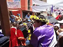 In Mexico, many communities stage processions and passion plays for Good Friday, which in some places extends into other days of Holy Week.[1] The Mexico City borough of Iztapalapa holds the largest and most elaborate of these, with up to 5,000 people participating and 150 of these with speaking roles.[1][2] While a religious event principally, it is also a community event, as only residents of the eight original communities of the borough (San Lucas, Santa Bárbara, San Ignacio, San Pablo, San José, San Pedro, La Asunción and San Miguel) can participate.[3][4] The event is popular, drawing crowds of anywhere from 2.5 million to four million from Mexico and abroad during the week that scenes are performed.[3][4][5] The play is also accompanied by news media helicopters and rows of police to keep control of the crowds.[1]