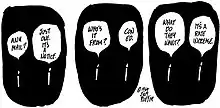 Feiffer had no stories to tell. His main concern was to explore character. In a series of a dozen or so pictures, he would show the shifts of mood that flickered across the faces of men and women as they tried, often vainly, to explain themselves to the world, to their husbands and wives, to their mistresses and lovers, to their employers, to their rulers, or simply to the unseen adversaries at the other end of the telephone wires ... It would be no exaggeration to say that his dialog is as acute as any that is being written in America today. Dialog aimed at sophisticated minds, usually with the purpose of shaking them out of sophistication into real awareness.[10]